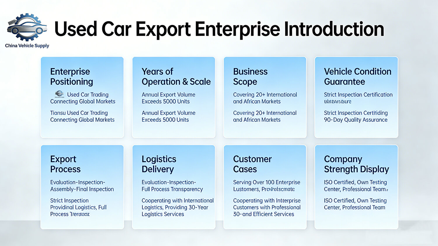 Chinavehiclesupply Auto is a professional and licensed used car exporter based in China, with years of experience in the international automobile trade. We specialize in exporting high-quality used vehicles including Toyota, Honda, Nissan, Hyundai, Mitsubishi and other popular brands to global markets.